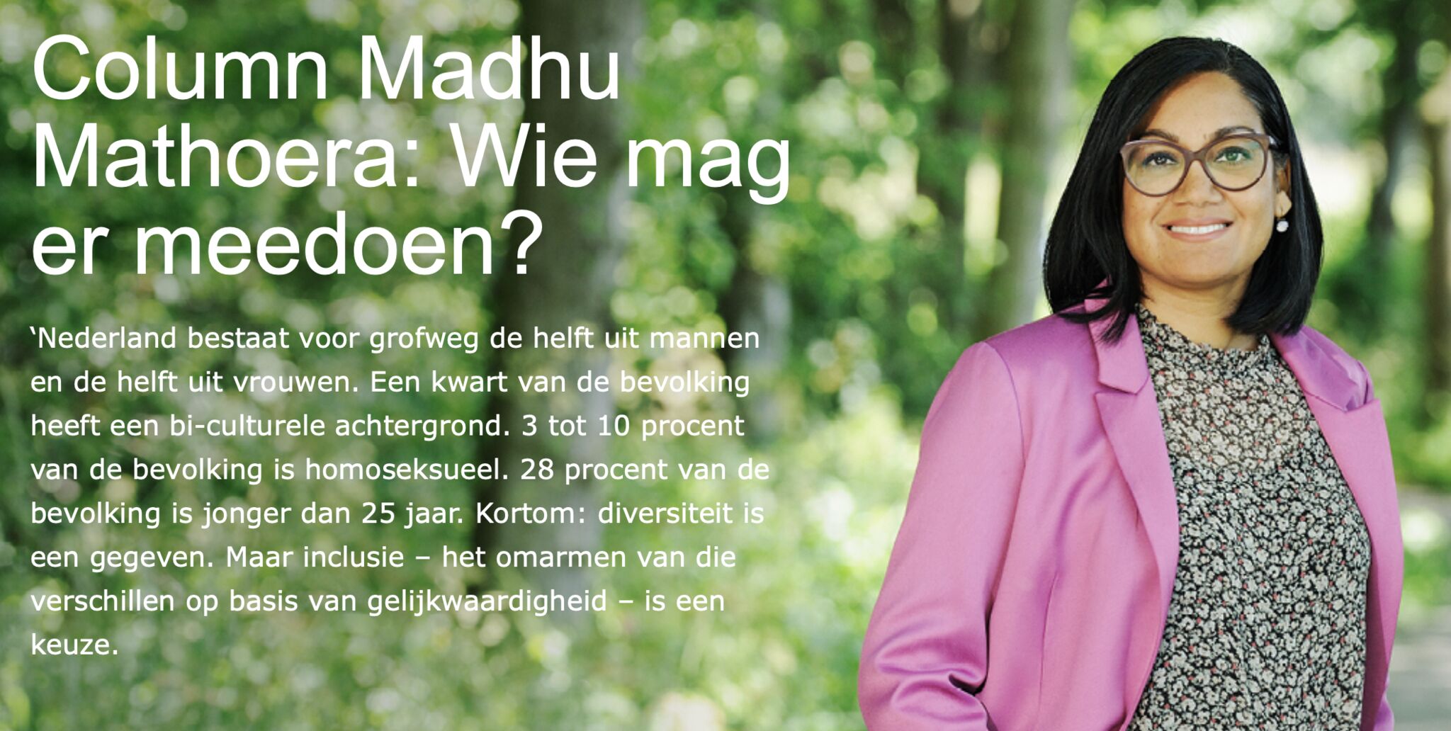 Lees meerDit artikel is geplaatst op https://www.uwv.nl/overuwv/magazines/uwv-magazine/2022-06/column/index.aspx ‘Nederland bestaat voor grofweg de helft uit mannen en de helft uit vrouwen. Een kwart van de bevolking heeft een bi-culturele achtergrond. 3 tot 10 procent van de bevolking is homoseksueel. 28 procent van de bevolking is jonger dan 25 jaar. Kortom: diversiteit is een gegeven. Maar inclusie – het omarmen van die verschillen op basis van gelijkwaardigheid – is een keuze. Hoe komt het toch dat je de diversiteit van de Nederlandse samenleving …